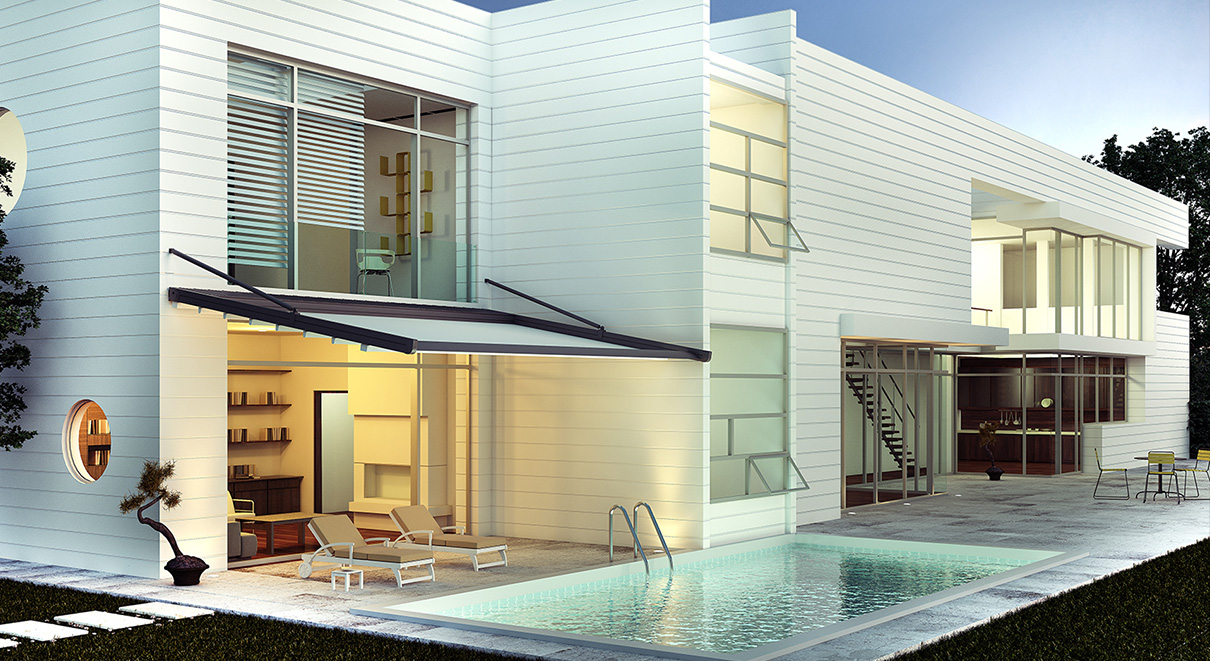 挑檐式電動遮篷 寬度: 1000~4500mm 伸縮長度: 1000~4500mm 下部弧形支撐 上部水平天幕簾